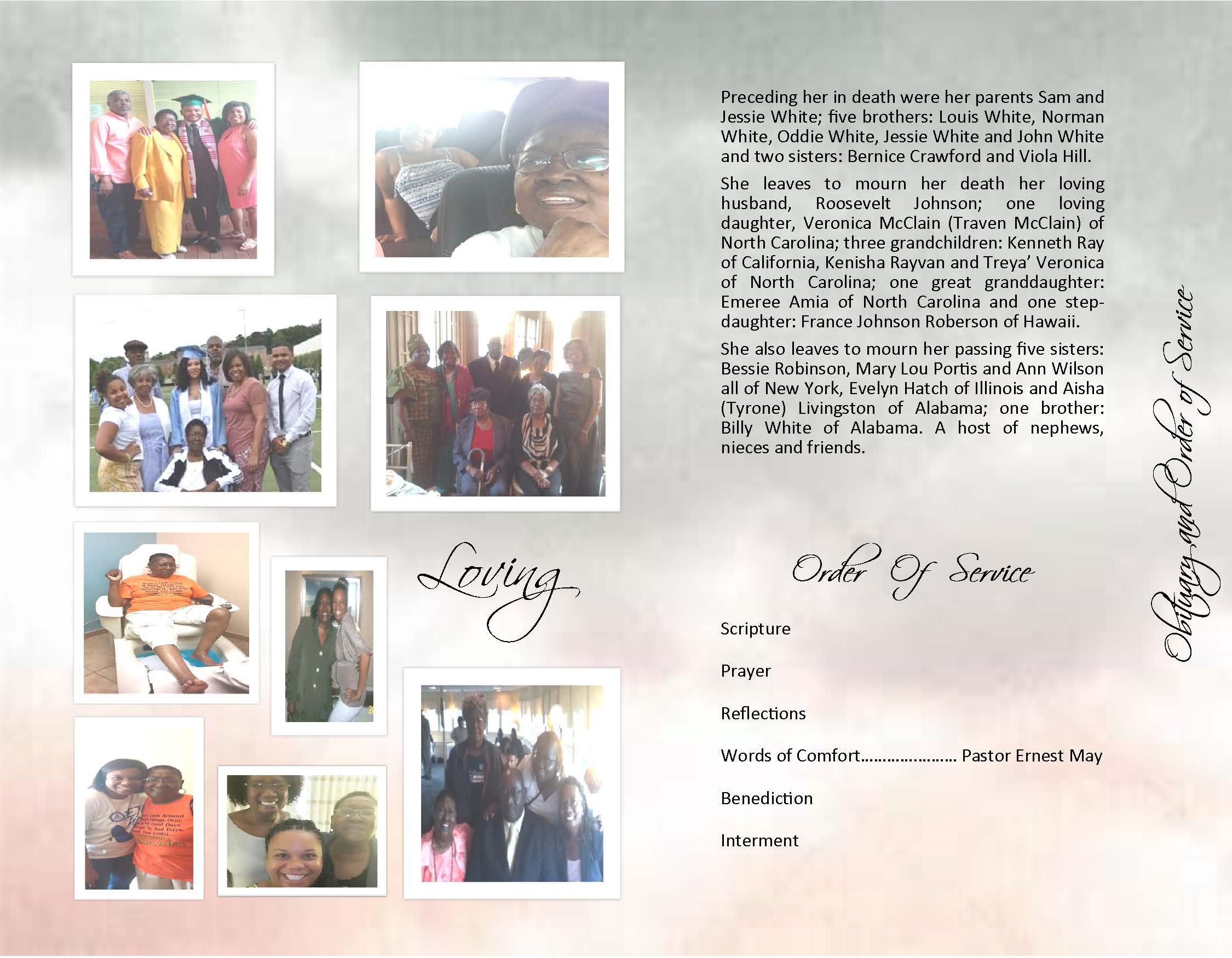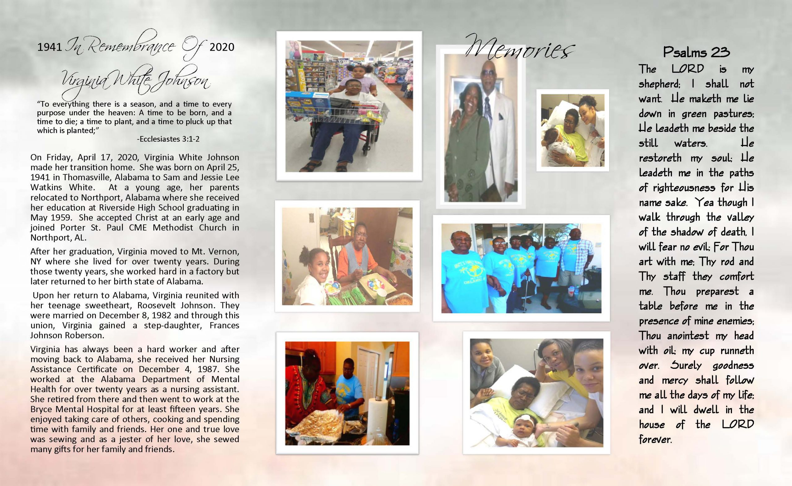 Private funeral services for Ms. Virginia G. Johnson will be held Monday, April 27, 2020, in the main Chapel of Wills’ Funeral Service, Pastor Earnest May will officiate, burial will follow in Cedar Oak Memorial Park. Wills’ Funeral Service of Northport in charge of all arrangements.