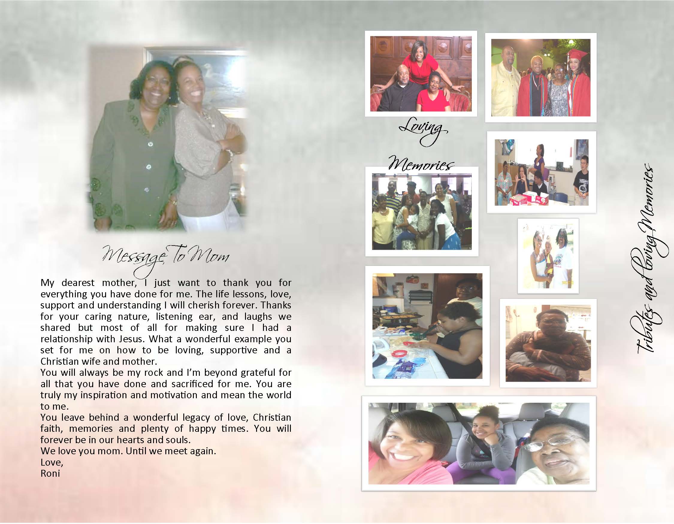 Although we are not with you physically, know that our hearts, thoughts, and prayers are. We love you guys and trusts that the Lord will bring you through this, one day at a time. May God grant you peace, comfort, and strength to endure.